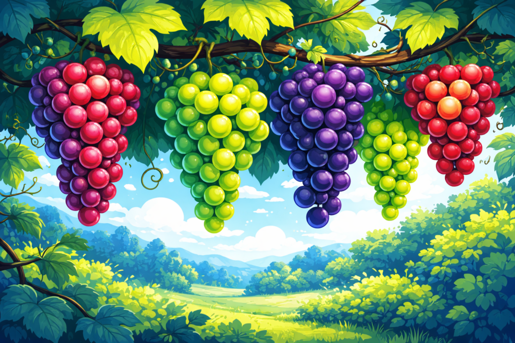 Grapes are small, juicy fruits that grow in clusters on vines. They come in many varieties, including red, green, purple, and black. People eat them fresh, dried as raisins, or turned into juice and wine.