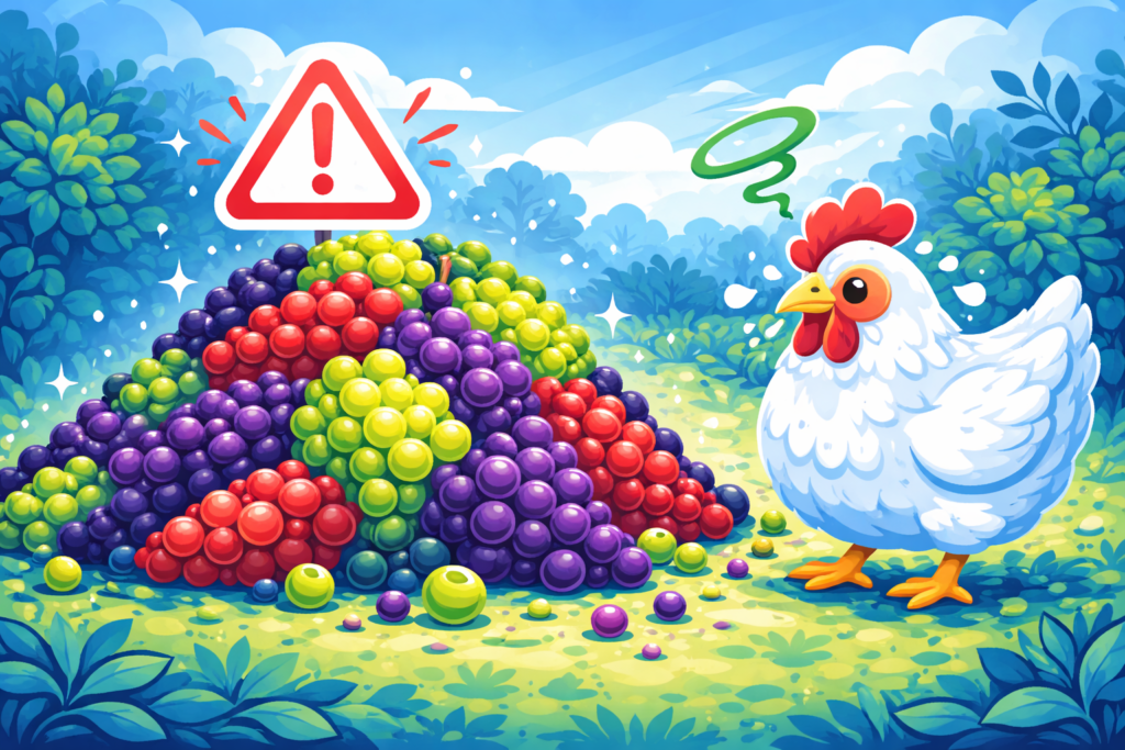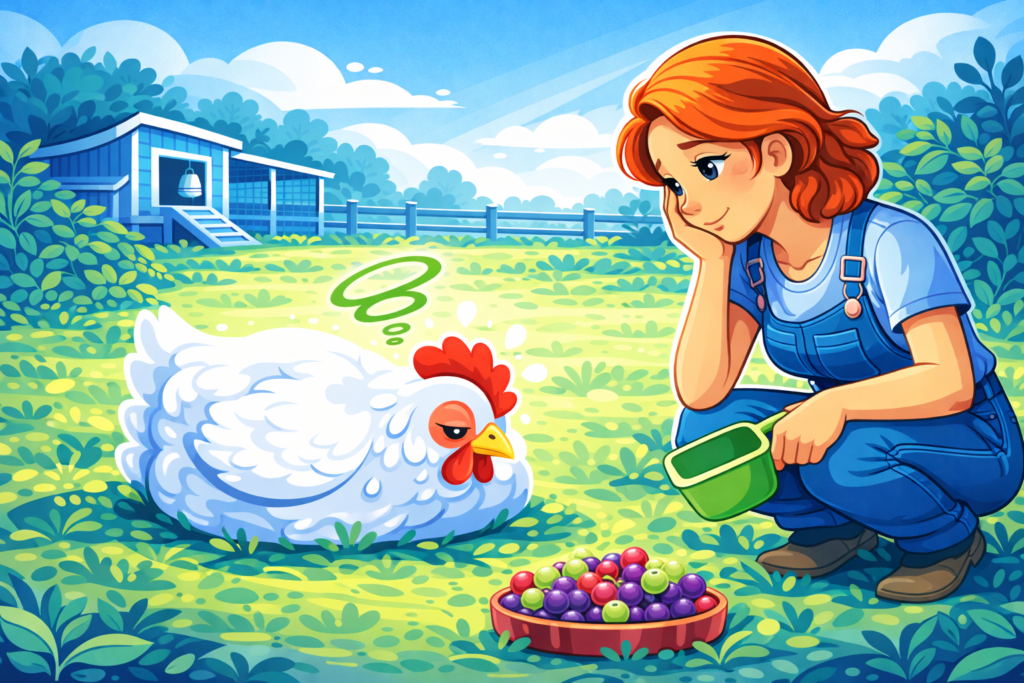 Too many grapes can reduce appetite for balanced feed. Chickens may ignore pellets or crumble because they’re full from treats. This is a warning sign, since skipping proper feed can lead to nutrient gaps if it continues for several days.