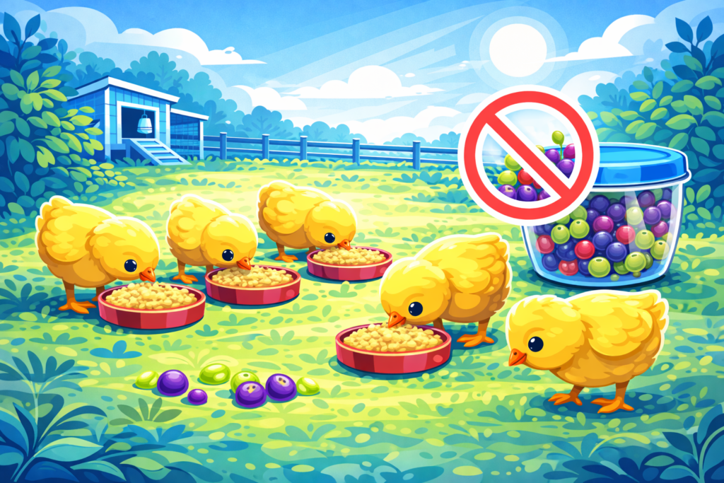 Feeding grapes too early or in large amounts can cause digestive upset and reduce appetite for essential feed. Whole grapes are also a choking hazard. If chicks show loose droppings or low energy, stop treats and return to basic feed only.