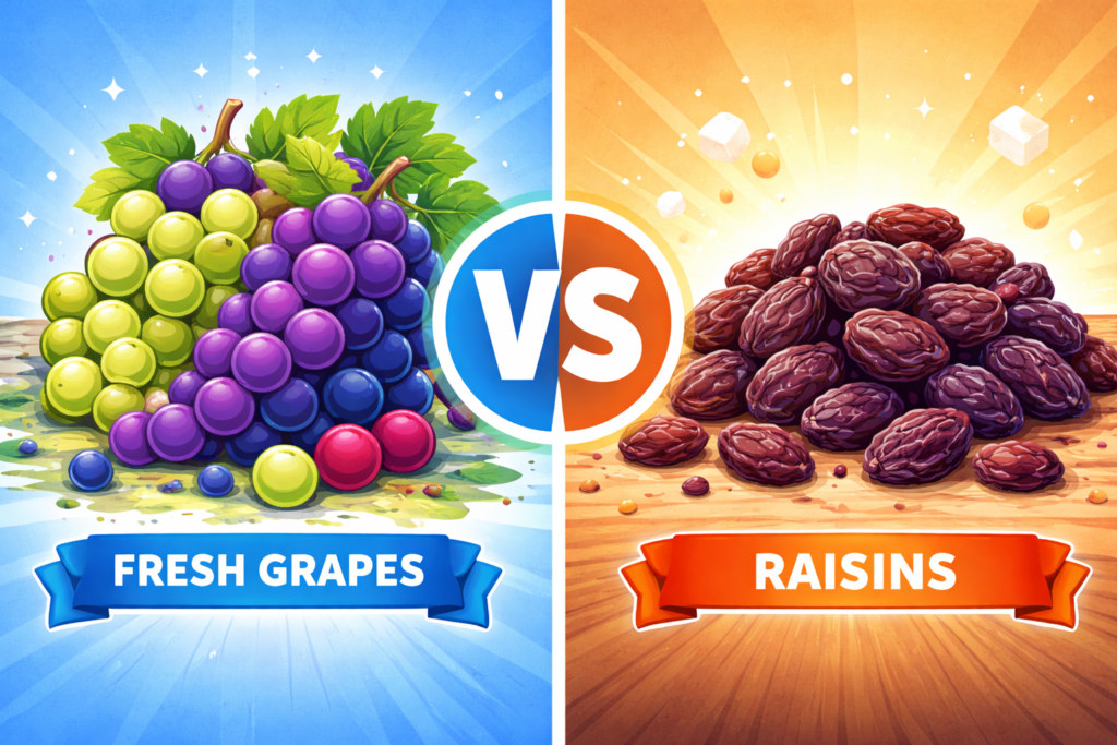 The main difference is water content. Fresh grapes are mostly water, while raisins are dry and compact. Because of this, raisins contain far more sugar and calories per bite. Chickens can handle fresh grapes more easily than dried ones.
