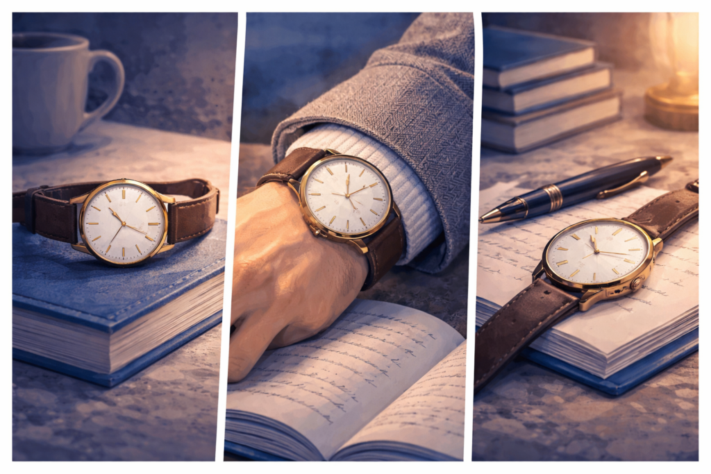 - Classic watch – Leather or simple metal watches feel timeless and intellectual.