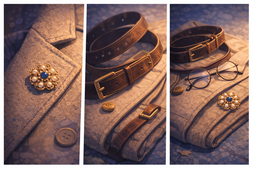 Small details like brooches and belts help tie dark academia outfits together. A simple brooch on a blazer or coat adds a refined focal point. Leather belts in brown or black define the waist and add structure. These accessories may seem minor, but they quietly elevate the entire look, proving that dark academia fashion thrives on thoughtful details.