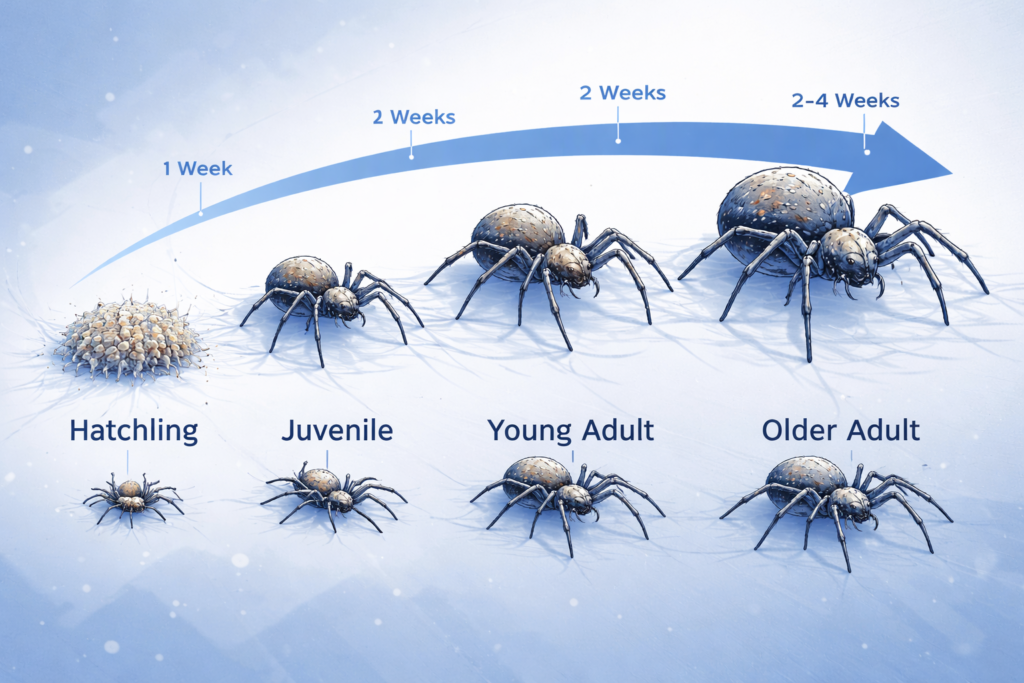 Spiders experience their lives through clear spider lifespan stages. From egg to spiderling to adult, each phase shapes how long they survive. Unlike mammals, spiders grow by molting, which means shedding their outer shell. These spider molting stages strongly influence lifespan because each molt requires energy and safety.
