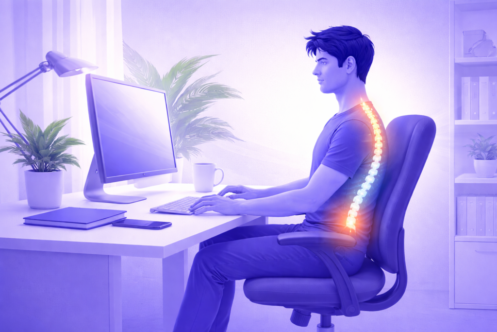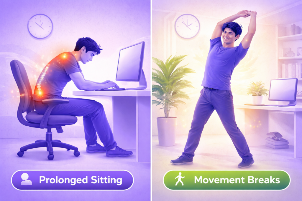 Prolonged sitting is one of the biggest triggers of sciatic pain. When you sit for hours, hip muscles tighten and the lower spine absorbs constant pressure. This reduces blood flow and compresses the nerve. Desk culture, streaming, and long commutes often encourage poor posture habits, which silently worsen lower back nerve pain. Standing up every 30–45 minutes, walking briefly, or gently stretching can break this cycle. Small movement breaks prevent stiffness and reduce the risk of flare-ups caused by inactivity.